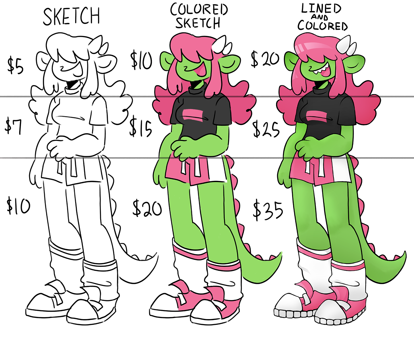 | Sketch | Colored Sketch | Lined + Colored | Pixelated + Colored (Not on Chart) | Lineless (Not on Chart) |